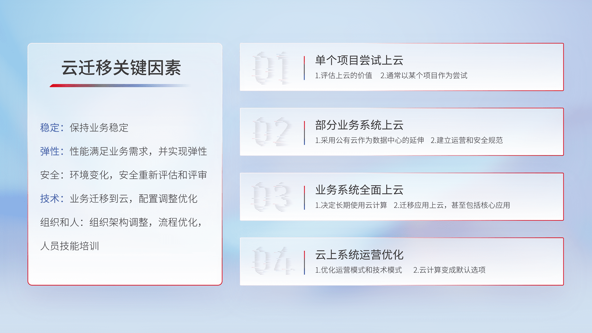 结合实际业务,,从规划设计、、、、云平台选型、、云原生改造、、数据迁移、、集成交付,,,迁移全过程为客户识别最佳上云路径,,,,做好风险识别管理,,设计网络架构、、、、身份权限、、安全审计合规、、操作审计、、、日志审计、、、监控告警策略、、、多站点容灾设计等,,对云上基础设施进行整体规划,,,,提升IT治理水平,,,以满足弹性、、高可用、、、高性能的需求。。。