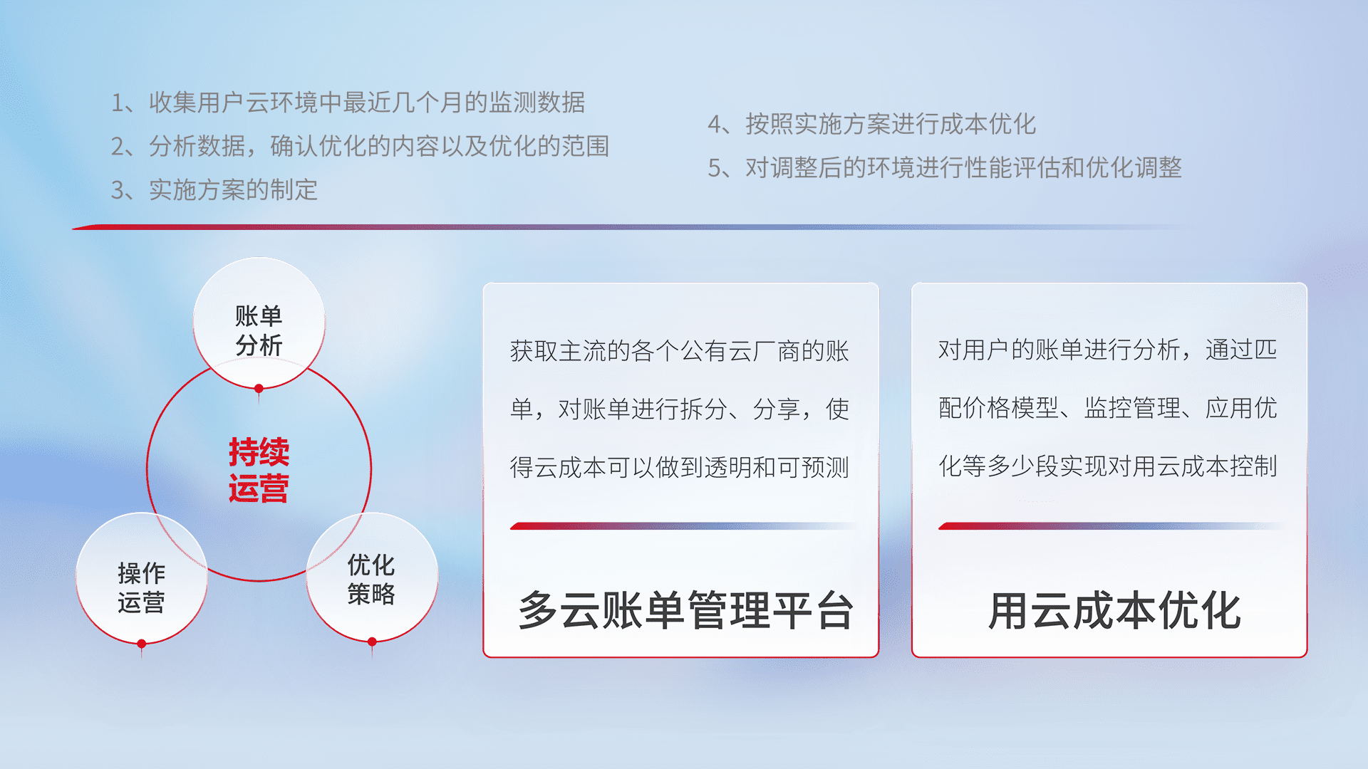 通过多云纳管,,,以统一的资源数据模型把客户的云资源进行抽象和封装,,,进而实现对多云资源的统一操作,,保障云资源管理的可靠性、、、、稳定性与可用性。。量身定制化运维内容,,,配置、、、开发运维、、补丁管理、、、、备份、、监控、、、、认证和访问管理、、、、审计和日常巡检等,,保障在用云过程中的可靠度,,,,稳定度以及高可用率。。。