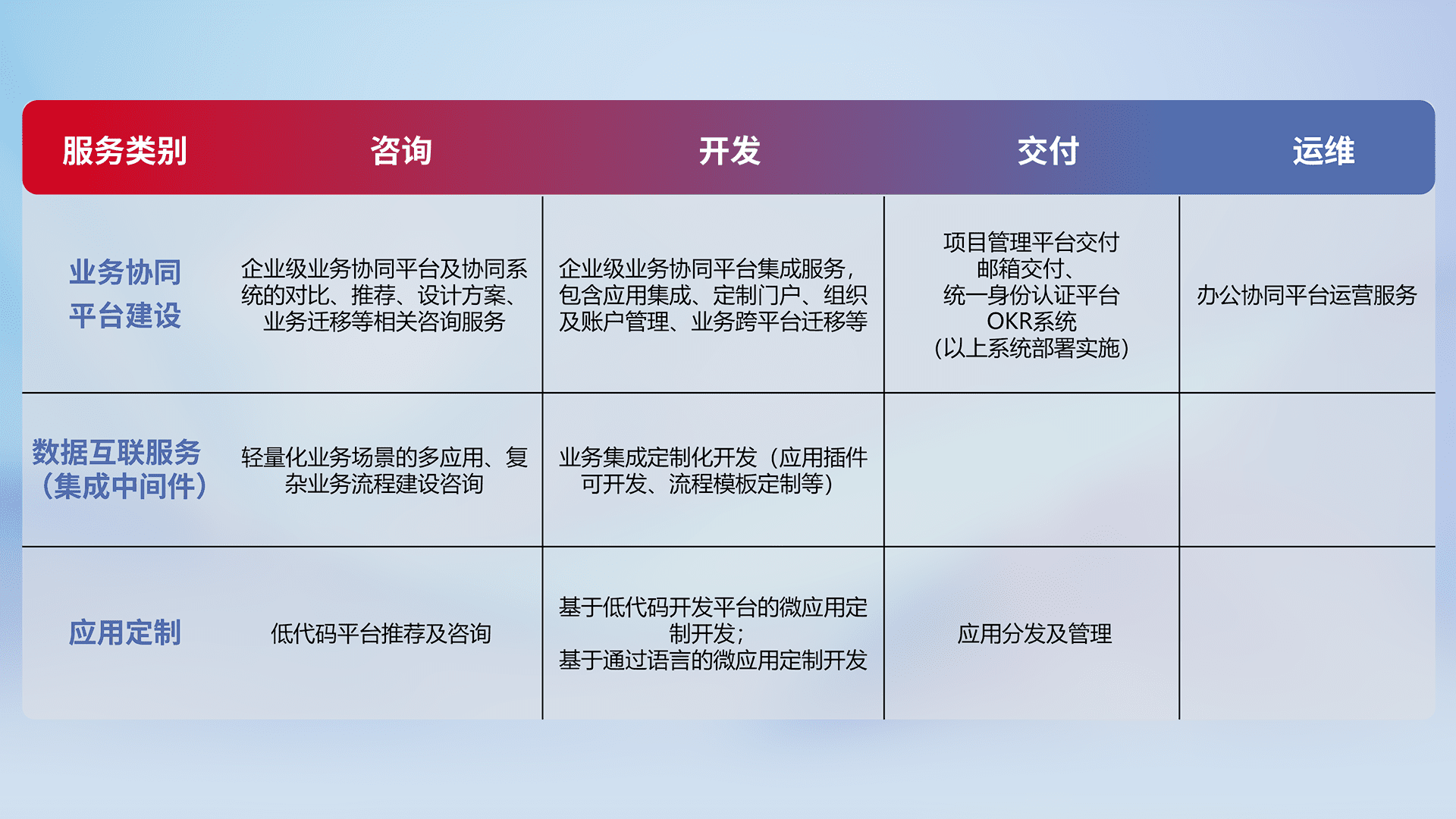 针对钉钉、、、、企微、、、、IDaas等平台级产品提供产品的规划、、方案、、交付、、、定制化开发等服务,,,实现如统一协同办公、、、、智能客户服务、、、混合会议管理、、、智能数据查询、、、等业务场景,,,实现数字化转型。。。